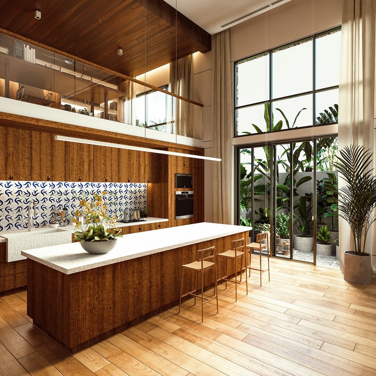 L'expression artistique s'étend également à la cuisine, où la crédence en faïence se distingue par l'utilisation ingénieuse "d'azulejos" aux motifs imaginés par Athos Bulcão, soigneusement réédités par le Studio Vetro. Chaque élément, minutieusement choisi, contribue à une fusion captivante entre l'esthétique traditionnelle et contemporaine, créant ainsi une atmosphère distinctive qui transcende les frontières du quotidien.