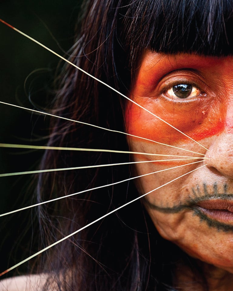Au cœur de l'identité visuelle réside un visage indigène orné de détails nasaux et de peintures faciales, célébrant ainsi la culture précieuse des peuples autochtones. Cette fusion artistique rappelle l'importance de préserver ces cultures riches et variées.