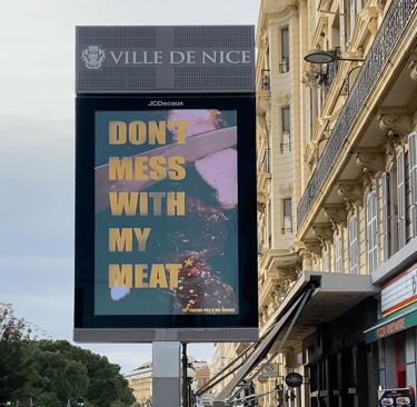 Dans les rues de Nice, les écrans JCDecaux ont diffusé un spot publicitaire de 10 secondes réalisé pour le restaurant brésilien Rodízio Nice. Le passant est interpellé par le jeu de mots "Don't mess with my meat" (Ne touchez pas à ma viande), conçu pour attirer l'attention avec humour.