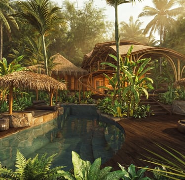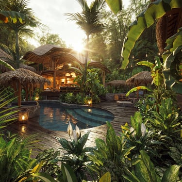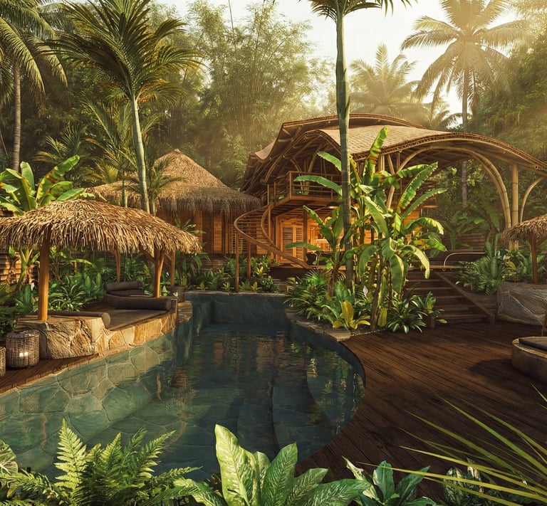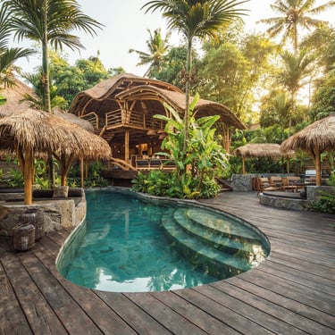 La composition du projet s’organise autour de plusieurs pavillons indépendants répartis dans un jardin tropical. L’ensemble accueille cinq chambres, chacune disposant de son propre espace, afin de préserver l’intimité des occupants tout en favorisant une relation directe avec la nature environnante. Les différents bâtiments sont reliés par une piscine aux formes organiques qui traverse le jardin et établit un lien fluide entre les espaces. Cette configuration renforce l’idée d’une architecture du dedans-dehors, caractéristique de l’habitat balinais, où les limites entre intérieur et extérieur s’estompent au profit d’une expérience de vie ouverte sur le paysage.