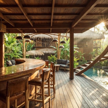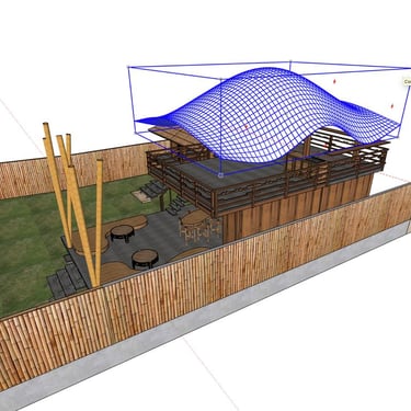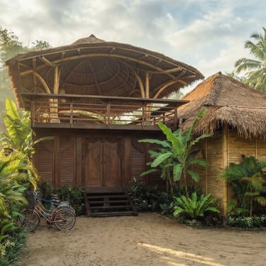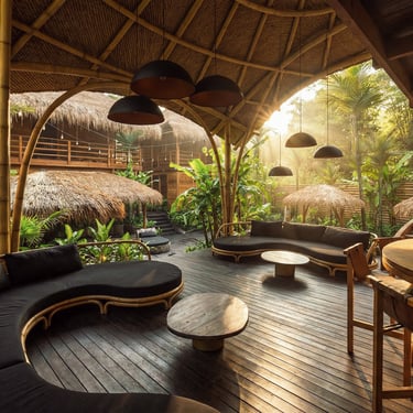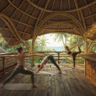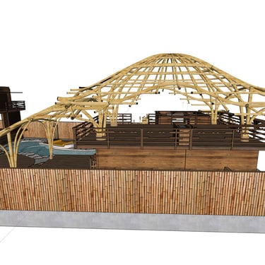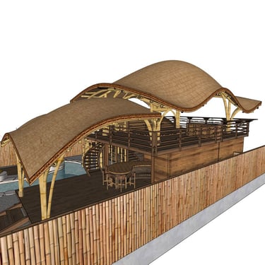 La structure de ce pavillon constitue l’élément architectural central du projet. Elle est entièrement réalisée en bambou courbé, selon des techniques inspirées des constructions locales. Cette structure soutient une toiture en pelupuh, des tuiles de bambou, dont la géométrie évoque la carapace d’une tortue, animal emblématique des côtes balinaises. Cette forme organique confère au bâtiment une identité forte tout en s’inscrivant dans une esthétique inspirée du monde naturel.